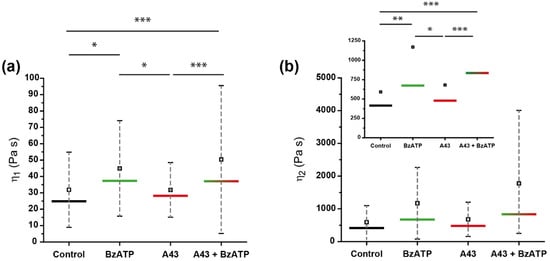 The relaxation times calculated for the viscous dashpots of the Maxwell elements were around one-tenth of a second and two seconds for the first () and the second elements (), respectively (Table S3). These values were close to those observed in previous works where this model of the cell was used [,]. Indeed, the work by Moreno-Flores et al. (2010) demonstrated the implication of actin cytoskeleton in both the relaxation times and viscosity of Maxwell elements and, on the basis of previous studies [], associated the first Maxwell element with the membrane-actin cortex and the second element with the cytoskeleton response. In our case, although the trend of those relaxation times did not appear to be significantly affected by the different treatments (except for a certain trend in ), the viscosity moduli calculated for both elements did, and such a response mainly occurred after the corresponding treatment with BzATP (Figure 5). As observed for the rest of the parameters, the antagonist A43 did not effectively block the increase in viscosity caused by exposure to the agonist but further promoted such an increment. This potentiation, although not statistically significant, was more pronounced in the case of the second Maxwell element (Figure 5b). An additional effect brought about by such receptor passivation was the much broader variability of the values obtained, most likely attributed to the diverse number of receptors expressed between the indented cells (n > 30).