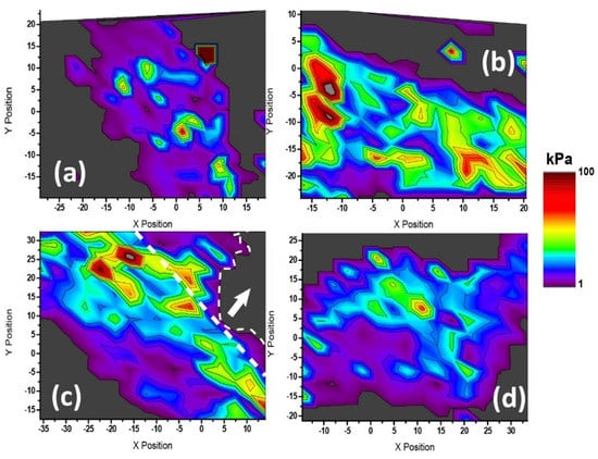 Figure 6 shows the 2D mapping of the elastic moduli extracted from the four systems under comparison: (a) untreated, (b) BzATP-treated, (c) A43-treated, (d) A43 + BzATP-treated. At first glimpse, the overall distribution of the values appeared quite affected when comparing that in Figure 6a to any other conditions (Figure 6a–d). In an untreated astrocyte, the highest elastic modulus values recorded appeared very localized into central positions, while the rest of the body yielded very regular and homogeneous values. This behavior was significantly affected when receptor stimulation took place. For these cases, larger moduli were observed all over the area being tested, with a notorious increment of cyan to green colors (in the range of 20–30 KPa). It must be noted that the presence of sharp local spots with very large values (such as in (b) and (c)) could be explained by underlying substrate detection, with astrocytes being very thin, while nucleus-topping regions appeared as broader and gradually incrementing (i.e., Figure 6d). The aligned stiffening observed in Figure 6c resulted from the presence of a neighboring cell, which caused the reinforcement along the cell–cell contact. When those values were taken aside, the behavior was a hybrid between Figure 6a,d. A quantitative comparison between the respective values is presented in the shape of histograms (see Figure S1).