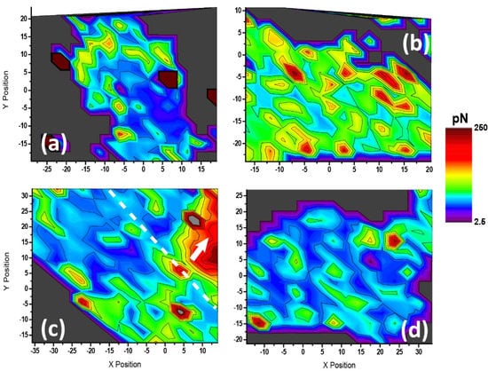Complementary mapping analysis was applied on individual cells, after the selection of an optimal zone and performance of an optical calibration. Then, measurements were run over a 32 × 32 pixel map covering between 30 and 40 µm2 areas, attending to the respective cell shapes. Each of these pixels originated individual force vs. distance plots recorded at the same conditions described above. As a main difference to previous measurements, the pause segment was omitted in the recording of the maps (retraction started at maximum load achievement) due to experimental feasibility, and the tip was immediately retracted at maximum loading force.