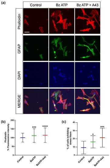 The body stress- or adhesiveness-induced distribution observed from the mechanical mappings above open the door to a discussion on how receptor stimulation can originate a localized accumulation of anchoring points between the astrocyte and the underlying substrate, indicative of how prone to motility cells are, etc. Therefore, selective staining and observation of proteins involved in such processes might contribute to obtaining a more precise picture of the ongoing situation. P2X7R stimulation could be inducing reorganization of cytoskeleton proteins, including actin cytoskeleton []. Morphological changes induced by BzATP were also evidenced by staining of actin filaments with rhodamine-phalloidin (Figure 8). Treatment of astrocytes with BzATP (300 µM) altered both parameters analyzed: fluorescence intensity and cells exhibiting stress fibers. Similar to what was observed in AFM experiments, blocking of P2X7R with the antagonist A43 did not reverse BzATP effects but further increased them. Therefore, a correlation between changes in actin cytoskeleton and cell mechanical properties caused by treatment with both agonist and antagonist were observed. The increase in actin stress fibers can be associated with an increase in cell stiffness and viscosity, as shown in previous work [,].