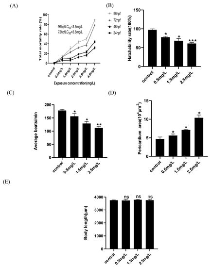 Diflubenzuron induces zebrafish embryonic developmental toxicity. Mortality of larvae after diflubenzuron exposure (A). The influence of diferent concentration of diflubenzuron exposure on hatchability rate (B), The qualification of heart rates of zebrafish larvae exposed to diflubenzuron (C), The qualification of pericardium area of zebrafish larvae exposed to diflubenzuron (D), The body length of zebrafish larvae exposed to diflubenzuron (E). Each bar represents mean ± SD (n = 24) of three independent experiments. The data represent mean ± SD, ns: no significant difference, * p < 0.05, ** p < 0.01, *** p < 0.001.