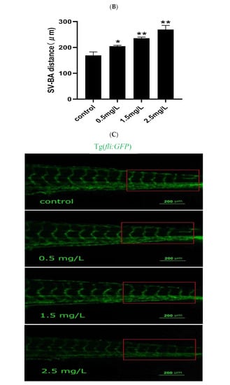 The decrease of heart beat and pericardium edema indicate that diflubenzuron exposure may induce the cardiotoxicity of zebrafish embryos. To further confirm the cardiotoxicity of zebrafish embryo induced by diflubenzuron, we carried out some experiments such as immunofluorescence, HE staining and fluorescence detection in heart and blood vessels of transgenic zebrafish model. The results showed that diflubenzuron exposure expanded the distance of SV-BA; the distance of SV-BA at the highest concentration was 1.59 times higher than that of the control group (Figure 2A,B). The results of HE staining also showed that diflubenzuron exposure caused the injures of sinus venous and bulbus arteriosus in zebrafish embryos (Figure S2A). The results of immunofluorescence showed that diflubenzuron exposure inhibited the proliferation of cardiomyocytes (Figure S2B). Furthermore, our results showed that diflubenzuron exposure caused damages to vasculature at the posterior region of zebrafish (Figure 2C).