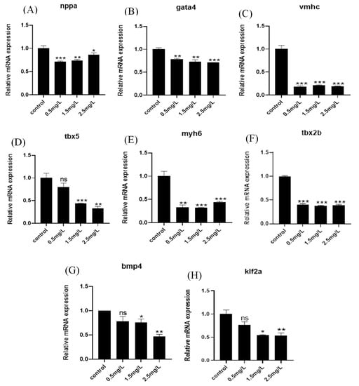 Effects of diflubenzuron exposure on mRNA expression in genes related to heart development. Gene transcription of nppa, gata4, vmhc, tbx5, myh6, tbx2b, klf2a and bmp4 in zebrafish embryos after exposure to diflubenzuron at 96 hpf. (A–H). Each treatment was repeated three times. Univariate ANOVA followed by Tukey test was used for differences between treatment groups. Different letters on the column indicate significant differences between treatments, ns: no significant difference, * p < 0.05, ** p < 0.01, *** p < 0.001 (Mean ± SD).