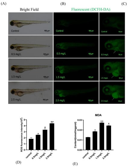 The level of oxidative stress in zebrafish embryos was detected. Diflubenzuron exposure promoted the accumulation of reactive oxidative species (ROS) in the heart; the ROS intensity at the highest concentration was 2.4 times higher than that of the control group (Figure 4A,B). Moreover, the exposure of diflubenzuron increased the content of MDA and inhibited the activities of superoxide dismutase (SOD) and catalase (CAT) in a dose-dependent manner (Figure 4C–E). These results showed that diflubenzuron exposure activated oxidative stress in zebrafish embryos.
