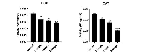 The abnormal expression of development-related genes is always accompanied by the activation of oxidative stress []. Oxidative stress is induced by the imbalance between the production of reactive oxygen species (ROS) and the antioxidant defense system, which is an important index to evaluate drug toxicity []. The homeostasis of cells is regulated by antioxidants and oxidants. SOD catalyzes the transformation of superoxide anion radical into H2O2 []. CAT is responsible for the subsequent degradation of H2O2 to produce non-toxic H2O [,,]. MDA content usually reflects the level of lipid peroxidation, which is considered as the main cause of impaired cell function caused by reactive oxygen species overexpression [,]. The pollutant always induces oxidative damages to body. Exposure to prothioconazole causes lipid peroxidation and oxidative damage in zebrafish embryos []. As expected, diflubenzuron exposure increased the content of ROS and MDA and inhibited the activities of SOD and CAT, which suggested that oxidative stress of embryos was activated (Figure 4).