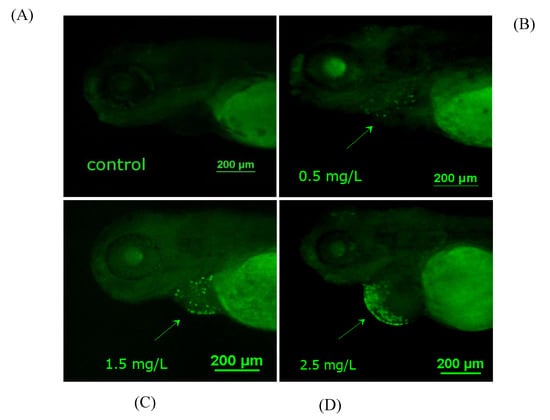 Diflubenzuron-exposed embryos (96 hpf) were collected and washed three times with embryo culture medium. The embryos were incubated with the culture medium containing 5 mg/L AO in darkness at 37 °C for 30 min. Then, the embryos were anesthetized and imaged by a fluorescent stereomicroscope (Nikon, Tokyo, Japan). Bright and granular green spots indicate the apoptotic cells in zebrafish embryos.