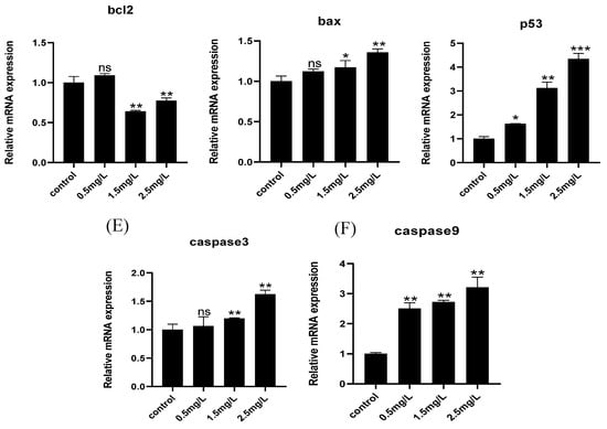 To further study whether diflubenzuron-induced oxidative stress activates apoptosis, AO staining was performed in embryos. Diflubenzuron exposure led to increasing granular green spots (apoptotic cells) in the heart region (Figure 5A). Moreover, the expression of apoptosis-related genes was detected, including p53, bax, bcl2, caspase3 and caspase9. The results showed that the expression of apoptosis-related genes was up-regulated in the embryos exposed to diflubenzuron (Figure 5B–F).