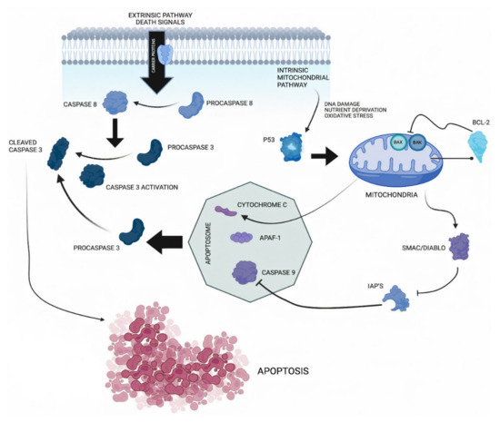 Caspase 3 is responsible for nuclear alterations in apoptosis, and it is considered the main effector caspase [50,51,52,53] since both extrinsic and intrinsic pathways lead to Caspase 3 activation [27,54,55,56] (Figure 1).