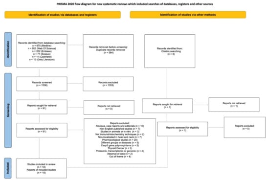 Medline (via PubMed), EMBASE, Scopus, Cochrane and Web of Science were searched from inception to June 2022. The last search was performed on 25 July for the screening of new published investigations. The Grey Literature Database (accessed on July 2022) was screened at the New York Academy of Medicine. Searches were conducted by combining thesaurus terms used by the databases (accessed on July 2022) (e.g., MeSH and EMTREE) and free text words. For Medline, the following algorithm was used: (“Head Neck Squamous Cell Carcinoma” [MeSH Terms] OR (“Head Neck Cancer” [All Fields] OR (“Oral Squamous Cell Carcinoma” [All Fields] OR (“Oral Cancer” [All Fields] OR (“Premalignant Lesions” [All Fields] OR (“Oral Lichen Planus” [All Fields] OR (“Oral Leukoplakia” [All Fields] AND “CASP3” [All Fields]) OR “Caspase-3” [All Fields] OR “Caspase 3” [All Fields] AND (“Prognosis” [MeSH Terms] OR “Prognostic” [All Fields] OR “Survival” [All Fields]). The aforementioned syntax was conveniently adapted for each database (accessed on July 2022).
