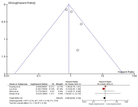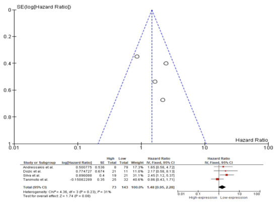 Forest plot and funnel plot for the association of higher Caspase 3 expression with disease-specific survival. Squares represent study-specific hazard ratios; horizontal lines represent 95% confidence intervals (CIs); diamonds represent the overall hazard ratio estimate with its 95% CI [14,57,71,73].