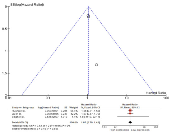 Forest plot and funnel plot for the association of higher Caspase 3 expression with disease-free survival. Squares represent study-specific hazard ratios; horizontal lines represent 95% confidence intervals (CIs); diamonds represent the overall hazard ratio estimate with its 95% CI [57,71,73].