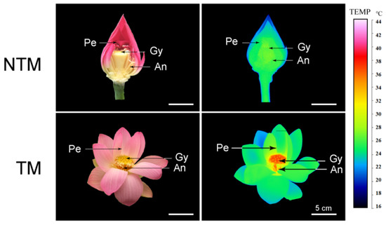 Photographs (left) and infrared thermal images (right) of N. nucifera flowers at the non-thermogenic (NTM; bud) and thermogenic (TM; female) stages. Temperatures in the infrared images are color coded, with red and green indicating higher and lower temperatures, respectively, in the receptacle. Pe, petal, Re, receptacle, An, anthers. Scale bars, 5 cm.