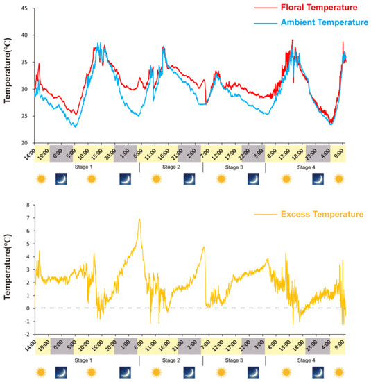 Variations in ambient (Ta) and flower (Ts) temperatures during N. nucifera flowering. Floral thermogenesis occurred during stage 1 (swollen stage), stage 2 (female stage), stage 3 (male stage) and stage 4 (fallen stage) but not during the non-thermogenic bud stage, the thermogenic peak (33.8 °C) was reached during stage 2; the ambient temperature was 22.3 °C.