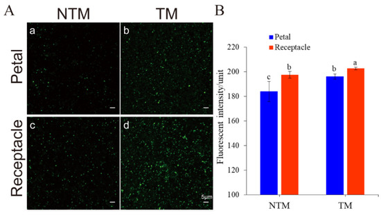 Mitochondrial dynamics in the receptacle and petals during the NTM and TM stages, as determined using MitoTracker Green (MTG). (A) Mitochondria labeled with MTG: Mitochondria in the petals during the NTM (a) and TM (b) stages. Mitochondria in the receptacle during the NTM (c) and TM (d) stages. (B) Comparison of mean fluorescence intensity in the receptacle and petals during the NTM and TM stages. The mean mitochondrial intensity in the petal during the TM (female) stage and NTM (bud) stage were 196.06 ± 2.04 and 184.00 ± 8.13, respectively. Additionally, the receptacle during the TM (female) stage and NTM (bud) stage were 202.69 ± 1.06 and 197.41 ± 2.83, respectively. The different lowercase letters indicate a significant difference in fluorescence intensity of mitochondria (B) between the floral stages according to the t-test. Data were analyzed from 10 flowers of TM and NTM stage, 3 sections (thermogenic vs. non-thermogenic) of each flower, 6 view fields for observation (88.56 μm2 per field). Data in the bars are the mean ± standard error and compared using the t test analysis. p < 0.01. Scale bars, 5 µm.