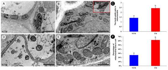 Morphology of mitochondria in the receptacle during the NTM and TM stages. (A,D) Morphology of mitochondria in the receptacle during the NTM (bud) stage. Most of the mitochondria are round or elliptical. (B,E) Morphology of mitochondria in the receptacle during the TM (female) stage. Most of the mitochondria are rod-shaped, long, elliptical, or dumbbell-shaped, and some are obviously elongated. Red rectangular box shows that the mitochondrion was dividing and was metabolically active. (C) Comparison of the mean length–width ratios of receptacle mitochondria during the NTM and TM stages. (F) Percentage of mitochondria to cell area in receptacle during NTM stage and TM stage. The different lowercase letters indicate a significant difference in the length–width ratio of mitochondria (C) and the mitochondrial coverage of cell (F) between the floral stages according to the t-test. Data in the bars are the mean ± standard error, 74–91 mitochondria per tissue section in (C) and 13–20 cells per tissue section of NTM and TM stage in (F). p < 0.001. Scale bars, 3 µm.