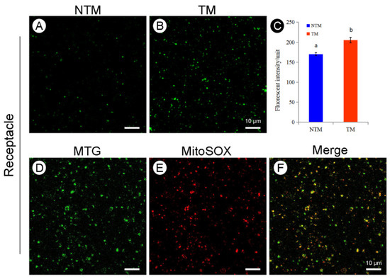Reactive oxygen species (ROS) production and subcellular colocalization of ROS and mitochondria in the receptacle during the NTM and TM stages. (A) Mitochondrial ROS production in receptacle cells during the NTM (bud) stage. (B) Mitochondrial ROS production in receptacle cells during the TM (female) stage. (C) Comparison of the mean fluorescence intensity of mitochondrial ROS in receptacle cells during the NTM and TM stages. In (C), the different lowercase letters indicate a significant difference in fluorescence intensity of ROS between the floral stages according to the t-test. Data in the bars are the mean ± standard error, n = 10 flowers, 3 sections per sample, 6 view fields for observation in (C). p < 0.001. (D) Mitochondrial fluorescence intensity in the receptacle during the TM stage. (E) Fluorescence intensity of mitochondrial ROS in the receptacle cells during the TM stage. (F) Overlapping images from (D,E) show ROS accumulation in receptacle mitochondria during the TM and NTM stages. Scale bars, 10 µm.