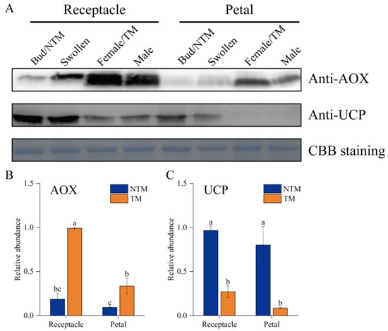 Western blot analyses of AOX and UCPs in receptacle cells during the NTM and TM stages. (A) Both AOX and UCPs were detected in the receptacles and petals during floral thermogenesis. Coomassie brilliant blue (CBB) staining is shown as a protein loading control. (B) Statistical analysis of protein abundance was based on three biological replicates for AOX and three for UCPs. Data in the bars are the mean ± standard error. AOX abundance was significantly higher during the TM than NTM stage in both the receptacles and petals. (C) UCP abundance were significantly higher during the NTM than TM stage in both the receptacles and petals. The different lowercase letters indicate a significant difference in protein abundance according to the t-test. n = 3 samples with three biological repeats. p < 0.001 versus TM receptacle group.