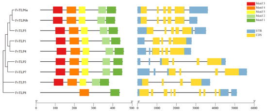 Conserved motif composition of FvTLPs and gene structure of FvTLPs. Distribution of conserved motifs in FvTLPs (left) and intron–exon structures of FvTLP genes (right). Rectangles of different colors represent different motifs, blue rectangles represent UTRs, black lines represent introns, and ginger rectangles represent exons.
