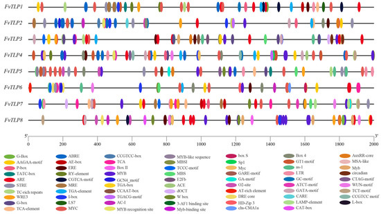 Promoters are important molecular tools for functional gene analysis [32] and for exploring the transcriptional regulation of FvTLPs; we identified the cis-elements in putative promoters (Figure 3). Cis-elements related to the light response, development, hormonal responses, and stress responses were unevenly distributed in the promoters of FvTLPs (Figure and Table). The AAGAA-motif and as-1 element are related to development [33]; the AAGAA-motif was detected in all FvTLP promoters, with the exception of the FvTLP5 promoter, and the as-1 element was detected in all FvTLP promoters, with the exception of the FvTLP7 promoter. The RY element is involved in seed-specific regulation and was observed in the FvTLP1, 2, and 4 promoters. E2Fb and MSA-like elements are involved in cell cycle regulation and were only detected in the FvTLP3 promoter. The GCN4_motif is involved in endosperm expression and was present in the FvTLP2 and FvTLP6 promoters. The CAT-box is involved in meristem expression and was only detected in the FvTLP8 promoter. The O2 site is involved in zein metabolism regulation and was observed in the FvTLP5, 6, and 8 promoters. The hormonal-responsive elements in the promoters of FvTLPs included gibberellin-responsive elements (P-box, TATC-box, CARE, GARE-motif, and ERE) [34], salicylic acid element (TCA-element), ABA-responsive element (ABRE), auxin-responsive elements (TGA-element, TGA-box, and AuxRR-core), and MeJA-responsive elements (CGTCA-motif and TGACG-motif). Gibberellin-responsive elements were observed in all FvTLP promoters, and auxin-responsive elements and MeJA-responsive elements were detected in all FvTLP promoters, with the exception of the FvTLP7 promoter. ABREs were detected in all FvTLP promoters, with the exception of the FvTLP6 and FvTLP7 promoters; TCA elements were observed in the FvTLP1,2,5, and 7 promoters. The stress-responsive elements in the promoters of FvTLPs included ARE (anaerobic induction), TC-rich repeats (defense and stress responsiveness), STRE (stress responsiveness), WRE3 (wound-responsive), LTR (low-temperature responsiveness), GC-motif (anoxic specific inducibility), MBS (drought stress responsiveness), WUN-motif (wound-responsive), and DRE core (drought stress responsiveness) elements. The occurrence of other stress-related elements in the promoters of FvTLPs was uneven, with the exception of the WRE3 element, which was present in all FvTLP promoters. Abundant MYC and MYB-binding motifs were observed in the promoters of FvTLPs.