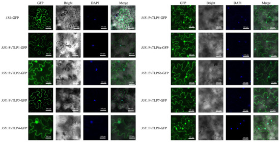 Detecting the subcellular localization of FvTLPs is essential for clarifying their functions. To characterize the subcellular localization of FvTLPs, GFP-tagged FvTLPs were expressed in tobacco leaves. The green fluorescence was observed in the nucleus and plasma membrane through confocal microscopy (Figure 4). This demonstrated that all FvTLPs were localized to the nucleus and plasma membrane.