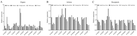 To explore the functional divergence of FvTLPs, the expression levels of FvTLPs in different tissues were determined. FvTLP1 and FvTLP4 were highly expressed in old leaves and flowers; FvTLP2 and FvTLP7 were highly expressed in the roots; and the expression of FvTLP3 was lower in the roots than in the other tissues. FvTLP5, FvTLP6a, and FvTLP6b were highly expressed in flowers, and FvTLP8 was highly expressed in the petiole (Figure 7A). The expression of FvTLP1, FvTLP6a, FvTLP6b, FvTLP7, and FvTLP8 in achene tissue and the receptacle decreased with fruit ripening. No significant variation was observed in the expression of FvTLP2 and FvTLP5 in achene during the fruit ripening process; however, the expression of these genes decreased in the receptacle as fruits ripened. The expression of FvTLP3 in achene and receptacle increased with fruit ripening. The expression of FvTLP4 decreased in achene tissue but increased in the receptacle as fruits ripened (Figure 7B,C).