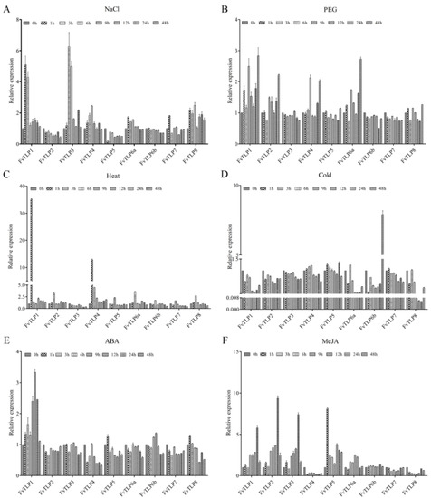Responses of FvTLPs to various abiotic stresses and hormone treatments. The expression profile of FvTLPs in the leaves under NaCl (150 mM) treatment (A), PEG6000 (10%) treatment (B), heat (42 °C) treatment (C), cold (4 °C) treatment (D), ABA (100 μM) treatment (E), and MeJA (100 μM) treatment (F).
