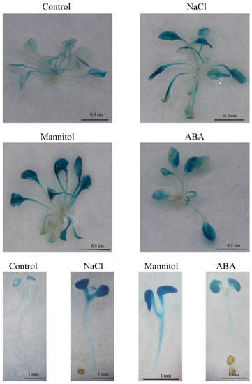 Transgenic Arabidopsis seedlings were grown on half-strength MS medium, and 3-week-old seedlings were transferred to half-strength MS medium supplemented with 150 mM NaCl, 200 mM mannitol, or 100 μM ABA for two days. Sterilized seeds were sown on half-strength MS medium supplemented with or without 75 mM NaCl, 75 mM mannitol, or 0.25 μM ABA for five days. After the stress treatment, histochemical GUS staining was performed following the method of Jameel et al. [67]. Briefly, the prepared materials were immersed in GUS staining solution buffer and incubated overnight at 37 °C. The plant tissues were then decolorized with 95% ethanol and observed under a light microscope.
