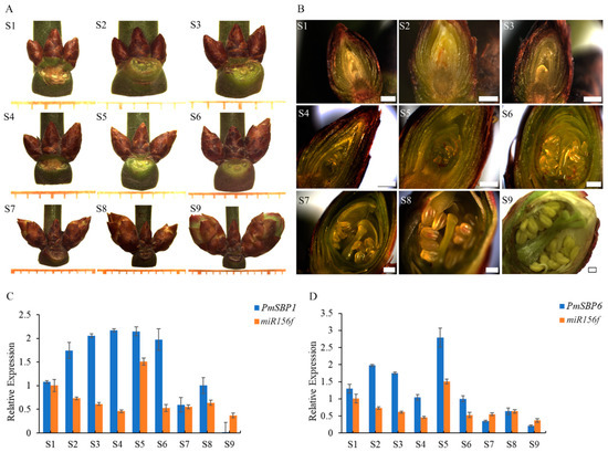 The flower development stages and the expression patterns of PmSBP1/6 and miR156f. (A,B) Flower buds at different development stages. S1: flower primordium forming stage, S2: sepal forming stage, S3: petal forming stage, S4: stamen forming stage, S5: pistil forming stage, S6: anther and ovule forming stage, S7: morphological differentiation finished stage, S8: alabastrum intumescence stage, S9: flower upcoming to bloom. S1–S7 belong to the flower bud morphological differentiation phase, and S6–S9 belong to the flower bud dormancy phase, the two phases have overlapping parts. The minimum scale in (A) = 1 mm, and the scale bar in (B) = 400 μm. (C,D) Expression patterns of PmSBP1, PmSBP6 and miR156f during the flower development period.