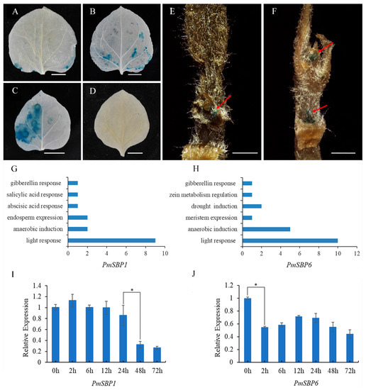 Analysis of the PmSBP1/6 promoter function and their response to GA3. (A,B) The activity of the PmSBP1/6 promoters. (C) The 35S::GUS positive control. (D)The negative control without any vector. The scale bar in (A–D) is 1 cm. (E,F) The spatial expression profile of PmSBP1/6. The red arrows indicate the location of GUS staining. The scale bar is 1 mm. (G,H). The promoter cis-elements composition of PmSBP1/6. (I,J) The expression of PmSBP1/6 under GA3 treatment. The asterisk indicates significant differences (p < 0.01).