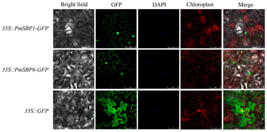 Subcellular localization of PmSBP1/6. The green, blue, and red fluorescence represent GFP fusion protein, nucleus, and chloroplast positions. The merge pictures were made of bright field, GFP, DAPI, and chloroplast pictures. The scale bar = 75 μm.