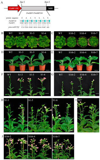 Overexpression of PmSBP1/1tb in tobacco. (A) The structure of PmSBP1/1tb recombinant vectors. (B–E) The phenotype of PmSBP1 and PmSBP1tb transgenic plants in the vegetative growth period (50 d and 80 d). (F,G) The flowering time of PmSBP1 and PmSBP1tb transgenic plants under short-day conditions (100 d). (H–J) The flowering time of PmSBP1, PmSBP1tb transgenic plants and WT under long-day conditions (110 d). The scale bar = 5 cm.