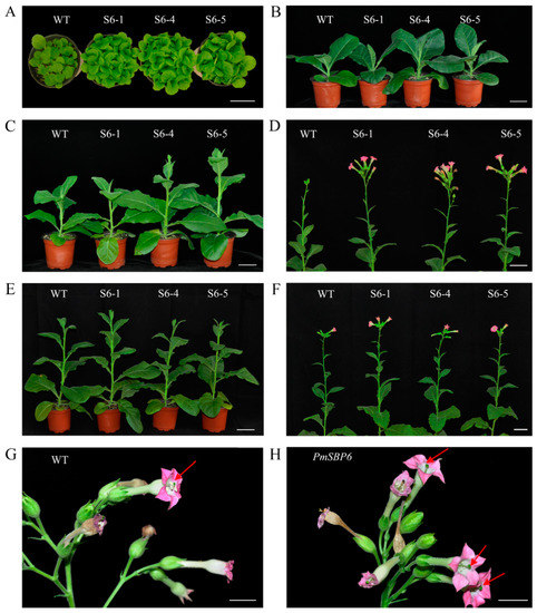 The phenotype of PmSBP6 transgenic plants. (A,B) The vegetative growth period of PmSBP6 transgenic plants (50 d and 80 d). (C,D) The flowering time of PmSBP6 transgenic plants grown in short-day conditions (90 d and 100 d). (E,F) The flowering time of PmSBP6 transgenic plants grown in long-day conditions (100 d and 110 d). (G,H) The flower phenotype of WT and the PmSBP6 transgenic tobacco. The red arrows indicate the relative height of stigma and stamen. The scale bar = 1 cm.