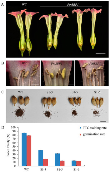 In the reproductive growth stage, the 35S::PmSBP1tb transgenic tobacco was normal, but the 35S::PmSBP1 and 35S::PmSBP6 transgenic tobacco were different from the wild-type tobacco. In the wild-type tobacco, the length of style and filaments were the same, allowing them to be self-bred and bear fruit (Figure 5G). While in the 35S::PmSBP1 (Figure 6A) and 35S::PmSBP6 (Figure 5H) transgenic tobacco, the length of style and filaments were inconsistent. In the 35S::PmSBP1 transgenic tobacco, the length ratio of style to filament showed two phenotypes: one was the high-style (the style was higher than the filament) and the other was the short-style (the style was shorter than the filament). Among them, the high-style flower was the main phenotype (96%), with smaller size, withered anthers, less pollen, and fast-drying filaments (Figure 6A,B), which could not be self-pollinated. The pods became smaller and the seed number in one pod was less after artificial self-pollination (Figure 6C). The pollen viability of the high-style flower was tested by TTC staining and pollen germination in vitro. As shown in Figure 6D and Supplementary Figure S2, in the wild-type tobacco and three 35S::PmSBP1 transgenic lines S1-3, S1-5, and S1-6, the pollen staining rates were 85.8%, 41%, 32.5%, and 13.8%, respectively, and the pollen germination rates were 78.8%, 18.2%, 13.7%, and 12.5%, respectively. In short, the results of the two methods showed that the pollen viability of 35S::PmSBP1 transgenic plants was lower than that of WT. The flower phenotype in the 35S::PmSBP6 transgenic tobacco was partly different from the 35S::PmSBP1 transgenic tobacco. In the 35S::PmSBP6 transgenic tobacco, all the flowers showed a high-style phenotype with normal size, but the flowers could bear fruit normally after artificial self-pollination (Figure 5H).