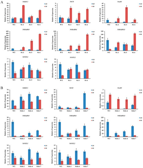 To investigate the early flowering transgenic tobacco, the expression level of eight endogenous flowering-related genes (NtSOC1, NtCO, NtAP1, NtMADS3, NtMADS4, NtMADS11, NtNFL1, and NtNFL2) in the shoot tip of tobacco (90 d in short-day conditions, 100 d in long-day conditions) was detected by qRT-PCR. The expression level of these eight endogenous flowering-related genes in the three PmSBP1 transgenic tobacco lines is shown in Figure 7A. In short-day conditions, their expression was higher than that of the wild-type tobacco; while in long-day conditions, the expression level was lower than that of wild-type tobacco, except for NtSOC1 showing similar expression to wild-type tobacco. As shown in Figure 7B, the expression level of the endogenous NtSOC1 in the PmSBP1tb transgenic tobacco was increased under both short-day and long-day conditions. In short-day conditions, the expression of the other seven flowering-related genes was similar to WT. In long-day conditions, the expression of NtCO only increased sharply in the PmSBP1tb transgenic tobacco line S1tb-7; however, it changed slightly in the other two lines. The expression level of NtAP1, NtMADS3, NtMADS4, and NtMADS11 in all three lines decreased; however, the expression of NtNFL1 and NtNFL2 fluctuated marginally. As shown in Figure 8, the expression level of these eight flowering-related genes in the three PmSBP6 transgenic lines under short-day conditions was higher than that of WT. Under long-day conditions, their expression levels in the three lines fluctuated up and down at the relative expression value of WT. The expression level of NtSOC1 was directly proportional to the phenotype of early flowering in these transgenic plants.
