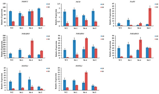 The relative expression of endogenous flowering-related genes in PmSBP6 transgenic tobacco under long and short conditions. S6-1, S6-4, and S6-5 were three transgenic lines.