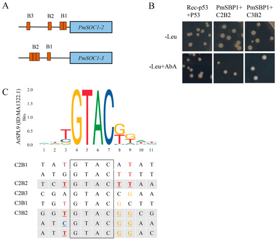 PmSBP1 binding to the PmSOC1s promoter. (A) The SBP binding sites on the PmSOC1s promoters. (B) The Y1H results of PmSBP1 and the PmSOC1s promoter fragments. (C) The analysis of the SBP-binding fragments in PmSOC1s promoters. The black box is the core component ‘GTAC’ of the SBP-binding fragments. The sequence logo of the SBP-domain in AtSPL9 (ID: MA1322.1) was downloaded from JASPAR (http://jaspar.genereg.net, accessed on 16 September 2022).