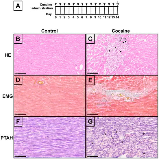 - Fineschi, V.; Baroldi, G.; Centini, F.; Cerretani, D.; Fiaschi, A.I.; Micheli, L.; Parolini, M.; Turillazzi, E.; Giorgi, G. Markers of Cardiac Oxidative Stress and Altered Morphology after Intraperitoneal Cocaine Injection in a Rat Model. Int. J. Leg. Med. 2001, 114, 323–330. [Google Scholar] [CrossRef] [PubMed]