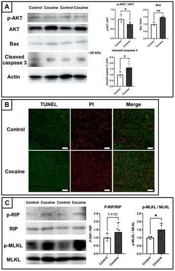 2.5. Involvement of Apoptosis and Necroptosis in the Damage to the Myocardium Caused by Cocaine Administration