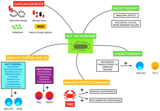 Influence of some of the mentioned gut microbiomes on carcinogenesis, immune system and response to immune-checkpoint inhibitors (ICI), immune reprogramming on tumor microenvironment (TME), radiotherapy and chemotherapy.