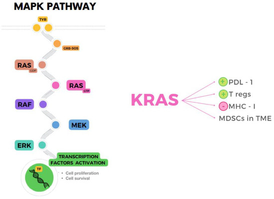 The MAPK pathway, shown in Figure 2, is the result of a kinases cascade activation that, after several phosphorylations, leads to cell proliferation and survival through growth factors. The kinases RAF, MEK and ERK are also known as MAPKKK, MAPKK and MAPK because of their function as enzymes that transfer phosphate groups. The MAPK pathway plays an essential role in promoting TME inflammation and evading the immune system, as a result of paracrine and autocrine secretion of tumor growth factors and cytokines, apart from maintenance of proliferation and reduced apoptosis in cancer cells [100]. The most studied molecule of the pathway, KRAS, was found to cause immunosuppression by several mechanisms, for example upregulation of PDL1, infiltration of MDSCs in TME, stimulation of Tregs by secretion of IL-10 and TGF-β1, or downregulation of MHC-I, which impairs the recognition of tumor associated antigens and neoantigens by CD8+ T cells [101,102,103]. Moreover, the alteration of signaling between cells induced by this pathway through impaired CD40:CD40L blocks maturation of antigen- presenting cells and activation of CD8+ T cells [104].