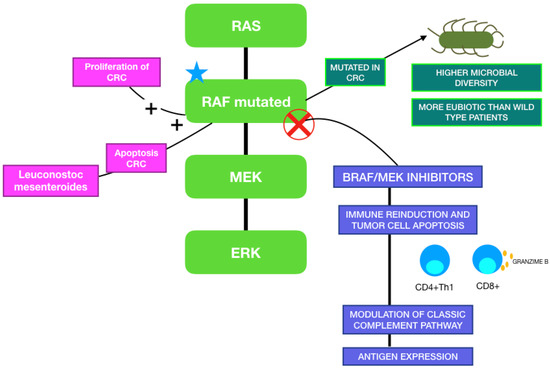 When focusing on the relationship between MAPK inhibitors and GM, although it has not yet been described in melanoma patients, it has already been studied in other types of cancer. Trivieri et al. analyzed fecal samples of 33 colorectal cancer (CRC) patients classified in BRAF-mutated or wild-type, and 13 healthy subjects. Patients with BRAF mutations were characterized by an abundance of Fusobacteria, Prevotella enoteca, Prevotella dentalis, Hungateiclostridium saccincola, Sutterella megalosphaeroides, Stenotrophomonas maltophilia and Victivallales bacterium. Interestingly, they also analyzed xenogeneic BRAF-mutated CRC models, which showed a higher microbial diversity than BRAF wild-type CRC controls. The BRAF-mutated microbiota signature was closer to healthy controls than the wild-type CRC model. The reason why patients with this mutation present with a more eubiotic condition is still not known, but it has been hypothesized that gut dysbiosis may have an influence only in the development of conventional CRC, or that fewer microorganisms in BRAF-mutated carriers are sufficient to initiate an oncogenic pathway [123]. Other studies showed that Porphyromonas gingivalis promotes proliferation of CRC in vitro by the activation of the MAPK pathway, and that Leuconostoc mesenteroides promotes apoptosis by modulating NF-κB, AKT, PTEN and MAPK [124,125]. Figure 3 illustrates the relationship between the MAPK pathway, the immune system and gut microbiota.AQUI.