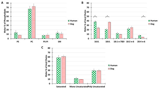 Lipid composition of SF from the knee joints of dogs and human healthy volunteers. The molar percentage of phospholipid classes in the total PL extract (A), acyl chain distribution in the total PL extract (B), and molar percentage of saturated, monounsaturated, and polyunsaturated acyls present in the total PL extract (C). Lipids were quantified as described in Materials and Methods. Data are presented as the mean ± SD of 5 dogs and 7 humans. p-values (t-test) less than 0.05 were considered significant (*).