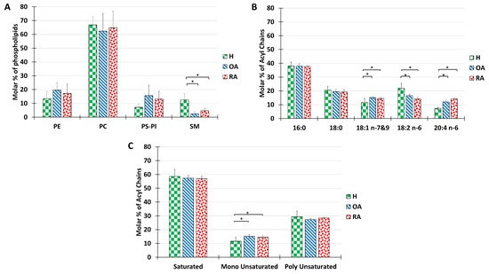 We then investigated whether this overall composition, which seems to be conserved between omnivore species, may be altered by pathological situations. To answer this question, the PL composition of healthy (H), OA, and RA synovial fluid was analyzed in detail (Figure 2). Our results indicate that the overall distribution of PL classes was maintained, except for a significant decrease of sphingomyelin observed between healthy samples and both pathologies (Figure 2A). As a bioactive lipid, sphingomyelin is implicated in a variety of physiological functions such as inflammation, once hydrolyzed to ceramide by the enzyme sphingomyelinase [51]. Metabolites obtained from ceramide such as S1P have key roles in the regulation of the trafficking and the functions of immune cells. S1P drives the differentiation of many immune cells, inducing changes in their function and regulating the production of pro-inflammatory cytokines [52].