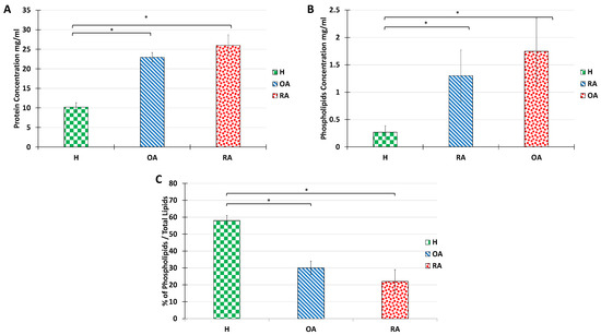 Mazzucco et al. have previously described that pathologies such as OA and RA, analyzed here, induce an increase in PL and protein amount, with a remarkable abundance of immunoglobulins [4]. Thus, we evaluated the amount of protein present in the SF extracts using a Bradford test (Figure 3A). The protein amount in healthy samples was estimated at 10 mg/mL, whereas we observed an over 2-fold increase in OA samples and a 2.5-fold increase in RA samples were recorded. The increase in protein content is in line with previous reports for OA pathologies [4], but is more limited than those reported for RA. The major difference observed in our case can be explained by the fact that RA samples analyzed here were obtained from patients with incipient pathology, in which SF was not contaminated with blood, and therefore protein amounts in samples were below the literature data, which ranges between 36 mg and 54 mg/mL. The protein profile for a healthy patient was dominated by albumins, whereas for RA and OA, the protein profile was dominated by globulins, which is consistent with a high inflammatory profile (not shown).