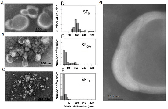 The ultrastructure of healthy synovial fluid showed a majority of MLV with a size around 180 nm (Figure 4A,D). Higher magnification showed a multilamellar structure of the lipid envelope (Figure 4G) with 5 to 7 lipid bilayers. Depending on the viscosity of the aqueous medium in which the dye is present, there is a lighter gray shade (negative stain diffuses less in a more viscous medium) or an intense gray shade (negative stain diffuses more in a more fluid medium). The vesicle inner core appeared as a light grey medium, whereas the background separating the vesicles was darker than the vesicle center. We can conclude that the viscous HA and protein-containing gel are embedded inside the MLV. This structure is conserved among animal species [26,27] and was successfully reproduced ex-vivo and described as “gel-in” type vesicles [7,26].
