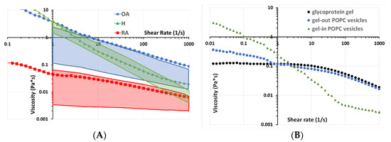 SF from RA patients displayed a lower viscosity value than H and OA over the entire shear rate range analyzed in the experiment (Figure 5A, red squares), in line with previously published studies (Figure 5A, red box).