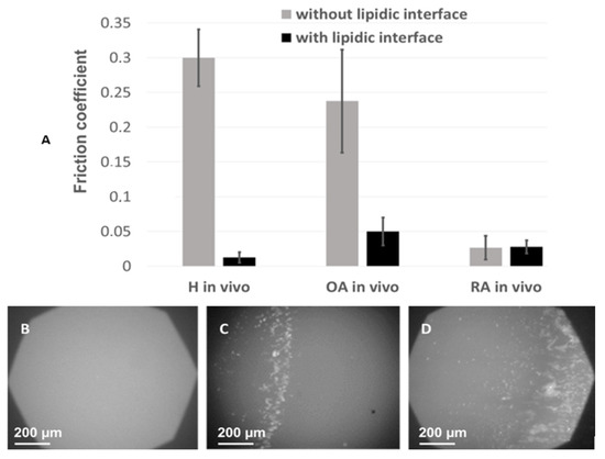 Samples of synovial fluid were included between the two surfaces and the friction coefficient was measured in the presence or absence of lipid layers, whereas wear of the two rubbing surfaces was analyzed by fluorescence microscopy. The 0.3 friction coefficient measured in the absence of lipids at the rubbing surfaces was high, in line with the high viscosity of SF under non-pathological conditions. It drastically decreased in the presence of lipid bilayers on the rubbing surfaces and in the presence of healthy SF samples (from 0.3 ± 0.03 to 0.008 ± 0.002 (m ± SD; Figure 6). Considering the physiological structure of the joint, where lipid bilayers cover the cartilage [54,55,56], this result is in line with the previously one previously reported one [57], and confirms the physiological role of SF in limiting friction at the joint.