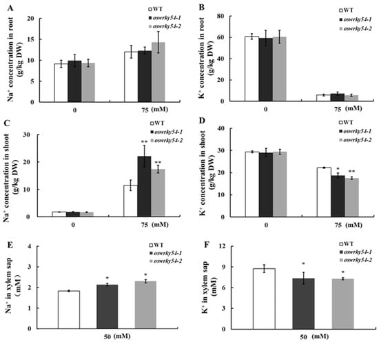 2.5. Loss of OsWRKY54 Alters Shoot Na+/K+ Homeostasis of Transgenic Rice