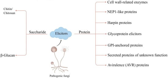 Classification of fungal elicitors. Known fungal elicitors can be classified into two major categories, including saccharide elicitors and protein elicitors. The figure is drawn by Figdraw.