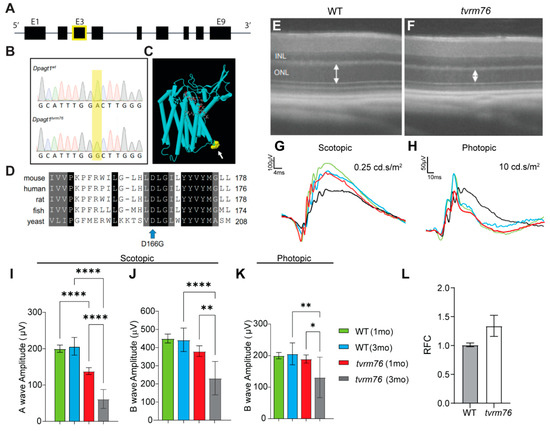 Through screening of N-ethyl-N-nitrosourea (ENU) mutagenized C57BL/6J mice by indirect ophthalmoscopy, a strain with pronounced degenerative fundus changes, and progressive pigmentary retinopathy was observed and named tvrm76. In order to determine the molecular basis of the tvrm76 variant, linkage analysis was performed. A recessive locus associated with the retinopathy was identified on Chromosome 9 within an approximately 20 cM region between markers D9Mit129 and D9Mit11. Whole exome sequencing revealed a missense mutation in exon 3 of Dpagt1, in which adenine 497 is replaced by guanine (c.497A > G) (Figure 1A,B). The Dpagt1 mutation co-segregated with the degenerative fundus phenotype in backcross progeny, from the mapping cross, as determined by indirect ophthalmoscopy and by optical coherence tomography (OCT) (Figure 1E,F). The A > G nucleic acid transition is predicted to cause a substitution of an aspartic acid residue by glycine (D166G). By comparison with the 3D structure of human DPAGT1 (UniProt Q9H3H5), the mutated amino acid is located in an interfacial loop between transmembrane ⍺-helical segments 4 and 5 of the DPAGT1 protein, and is conserved among species (Figure 1C,D). Measuring Dpagt1 expression levels using qPCR showed a slight increase in expression in eyes of mice homozygous for the tvrm76 mutation relative to wild-type controls, however the difference between groups was not significant (Figure 1L).